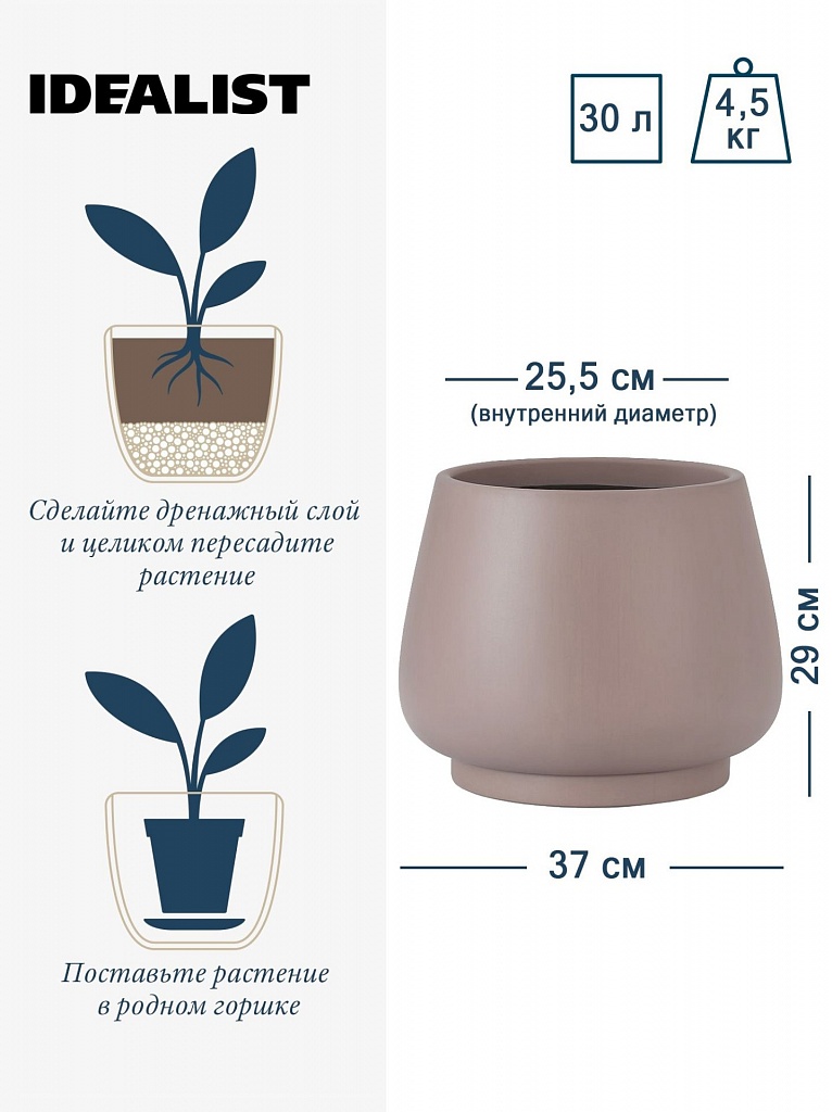 DUN37-BRN Напольное кашпо для цветов IDEALIST Премиум Дюна, Д37 В29 см, цвет кофе с молоком, чаша, 30 литров