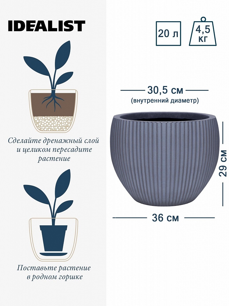 MAR36-GR Напольное кашпо для цветов IDEALIST Премиум Марс, Д36 В29, серое, круглое, 20 литров