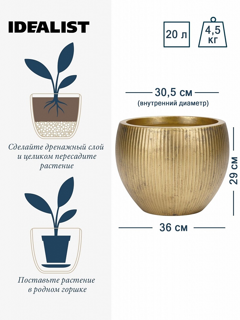 MAR36-GLD Напольное кашпо для цветов IDEALIST Премиум Марс, Д36 В29, золотое, круглое, 20 литров
