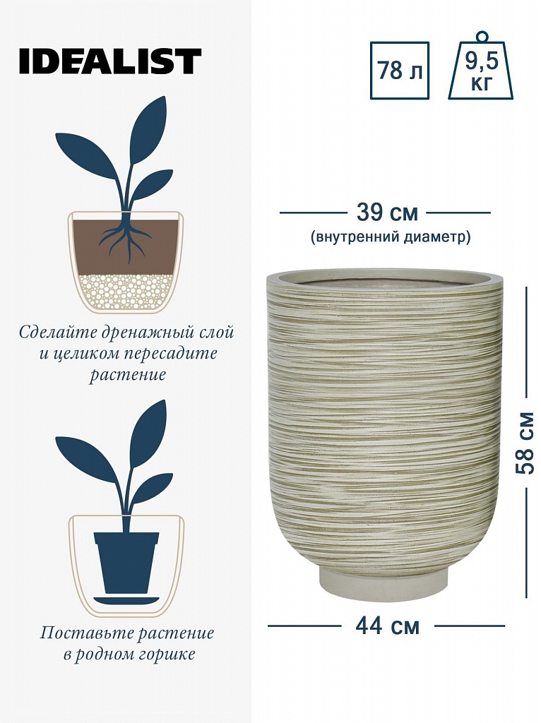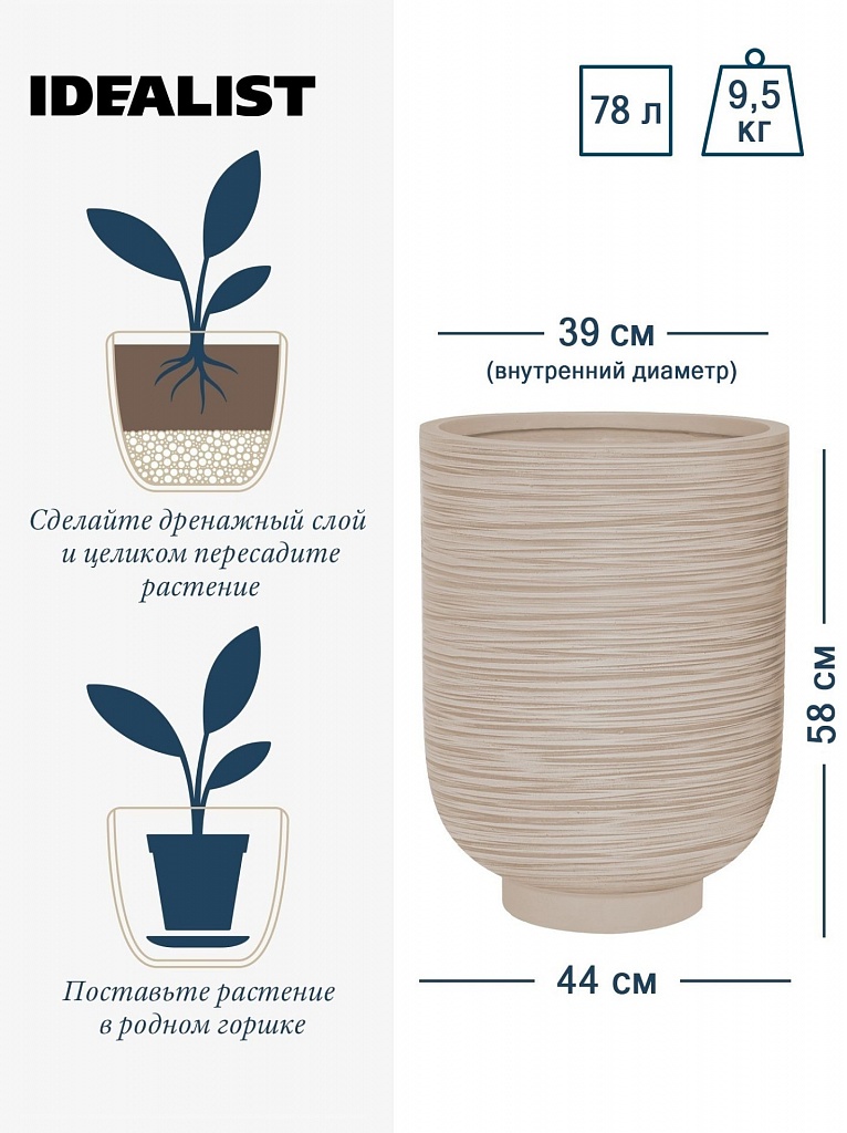 NEO44-BB Напольное кашпо для цветов IDEALIST Премиум Нео, высокое, Д44 В58 см, бежевое, 78 литров