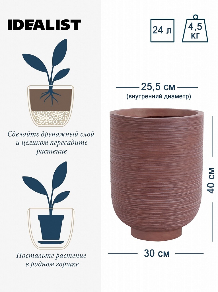 NEO30-BRN Напольное кашпо для цветов IDEALIST Премиум Нео, высокое, Д30 В40 см, цвет шоколад, 24 литра