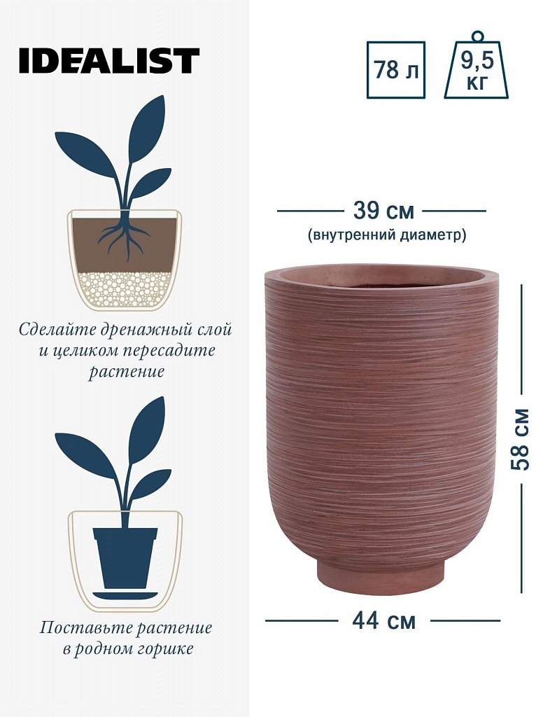 NEO44-BRN Напольное кашпо для цветов IDEALIST Премиум Нео, высокое, Д44 В58 см, цвет шоколад, 78 литров